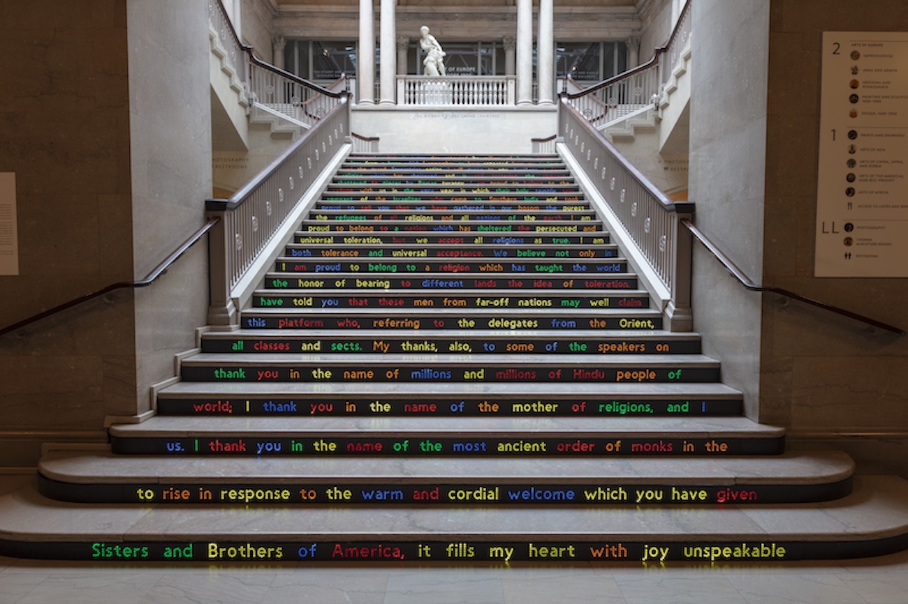 Each stair riser features illuminated text drawn from Indian Hindu monk Swami Vivekananda’s speech delivered on September 11, 1893, at the World’s Parliament of Religions, which took place in the same building complex that now houses the Art Institute. The excerpts appear in alternating bands of red, orange, yellow, blue, and green LED light, creating a structured visual system that unfolds sequentially as visitors ascend or descend the staircase.
