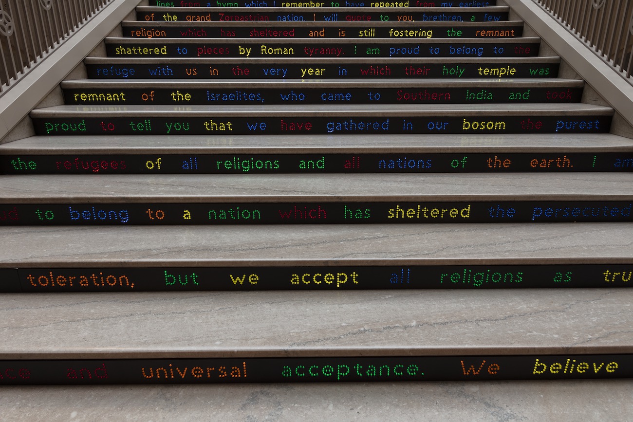 By situating Public Notice 3 on the Grand Staircase, a space typically treated as functional rather than contemplative, Kallat reframes the act of passage as an opportunity for sustained attention. The installation demonstrates how architecture can operate as a carrier of meaning, using a transitional zone to foreground historical continuity and ongoing relevance of Vivekananda’s message in a contemporary context.