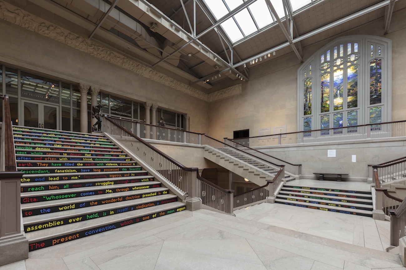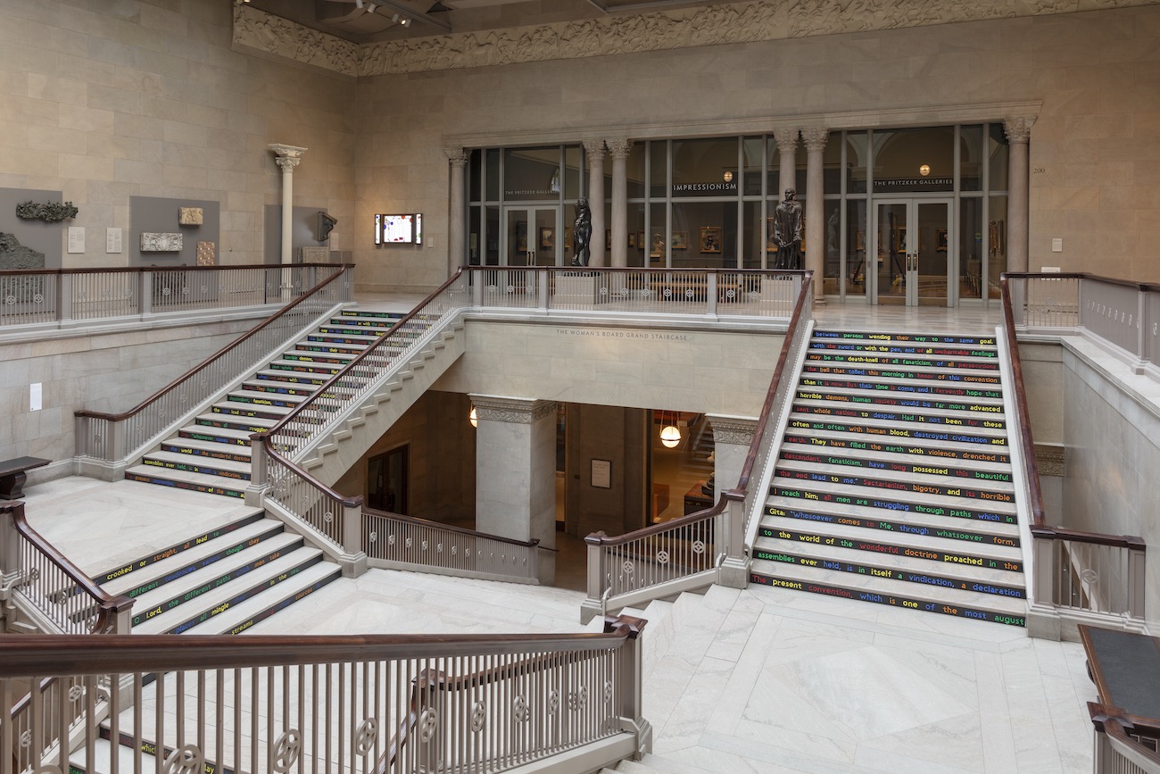 Jitish Kallat’s Public Notice 3 transforms the Art Institute of Chicago’s Woman’s Board Grand Staircase, covering all 118 steps with illuminated text that visitors read as they walk.